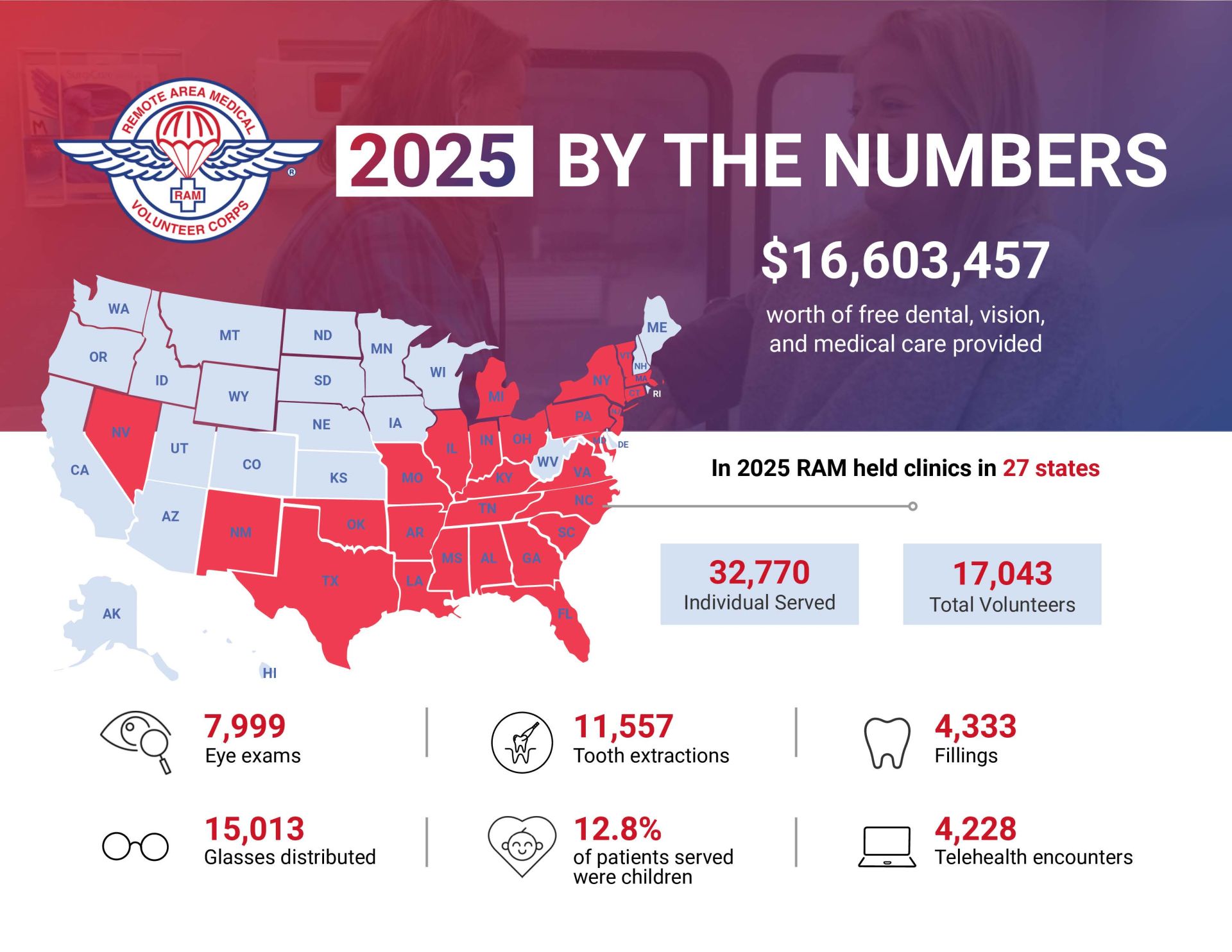 RAM hosts large-scale pop-up clinics across the United States, offering essential services at no cost to patients. These clinics rely on licensed medical and dental professionals who volunteer their time and expertise to care for thousands of patients each year.