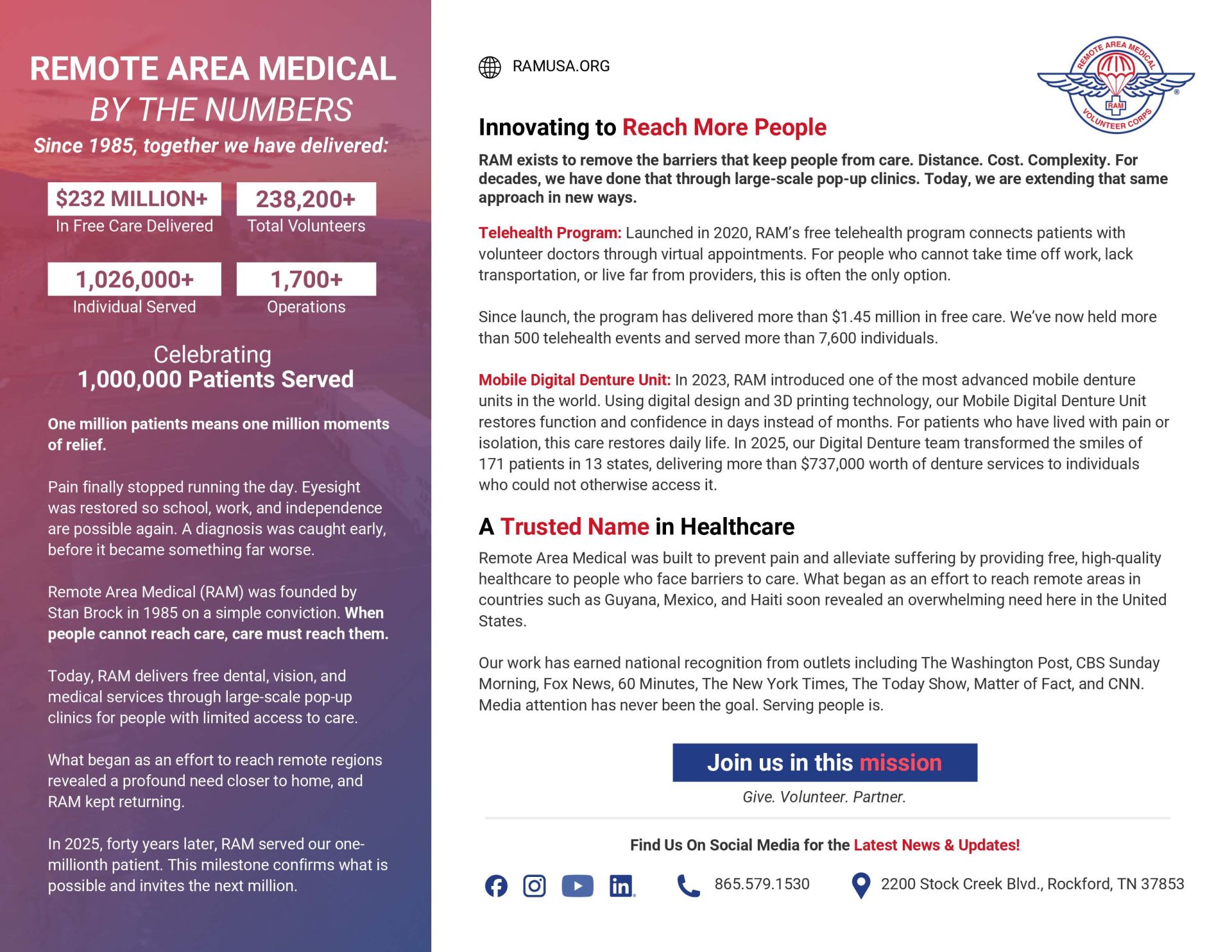 RAM is a nonprofit organization dedicated to preventing pain and alleviating suffering by providing free, high-quality medical, dental, and vision care to those in need.
